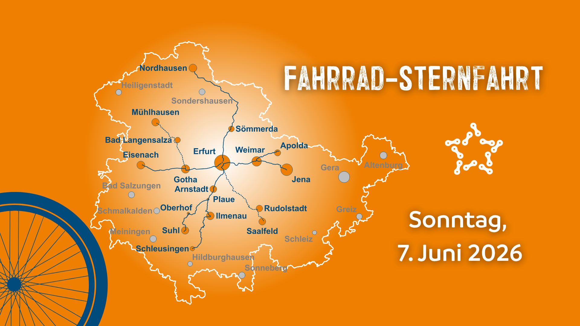 Für den 7.6.2026 plant der ADFC Thüringen seine erste Fahrrad-Sternfahrt. Gemeinsam radeln die Teilnehmenden aus ganz Thüringen nach Erfurt, um dort dem Thüringer Infrastrukturminister Steffen Schütz ein Forderungspapier zum Radverkehr zu übergeben.
