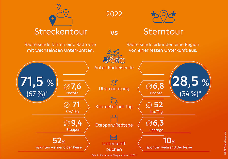 Die ADFC-Radreiseanalyse zeigt: 7 von 10 Reisenden (71,5 Prozent) entschieden sich 2022 für eine Streckentour, also eine Radreise entlang einer Route mit wechselnden Unterkünften, das entspricht dem Niveau vor der Corona-Pandemie (67 Prozent im Vorjahr). Gründe für die Radreise sind, Land und Leute kennenzulernen (rund 80 Prozent) und im Urlaub aktiv zu sein (rund 69 Prozent). Umweltfreundlichkeit spielt für 56,4 Prozent eine Rolle (52 Prozent im Vorjahr) und eine wachsende Zahl wählt den Radurlaub, da es eine erschwingliche Art des Reisens ist (21 Prozent, im Vorjahr 15 Prozent). Neun von zehn Radreisenden organisieren den Urlaub selbst und schätzen flexible und spontane Routenplanung und Unterkunftswahl. Campingplätze werden für Übernachtungen immer beliebter (29 Prozent, 20 Prozent im Vorjahr).
