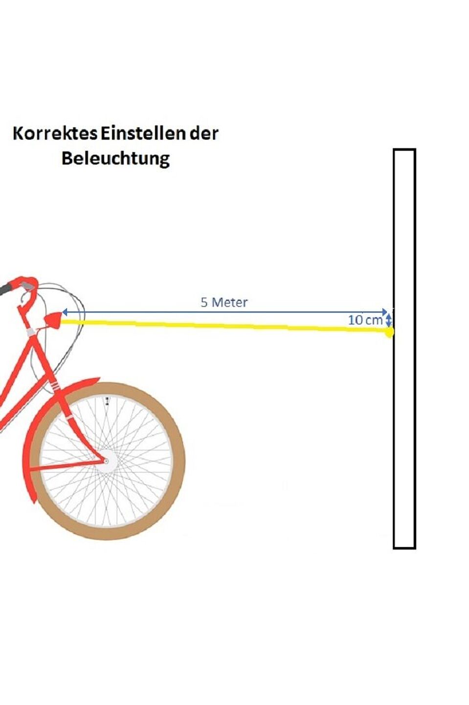 - Das Fahrrad senkrecht auf ebenen Untergrund so vor einer Wand aufstellen, dass sich der Frontscheinwerfer in 5 m Abstand dazu befindet..