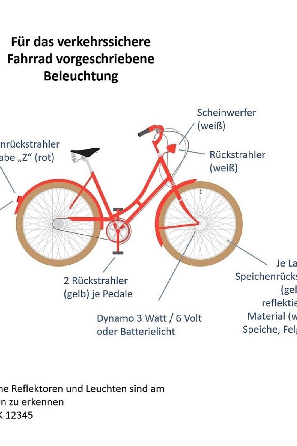 - mindestens zwei um 180 Grad versetzt angebrachte, nach der Seite wirkende gelbe Speichenrückstrahler an den Speichen des Vorder- und des Hinterrades.