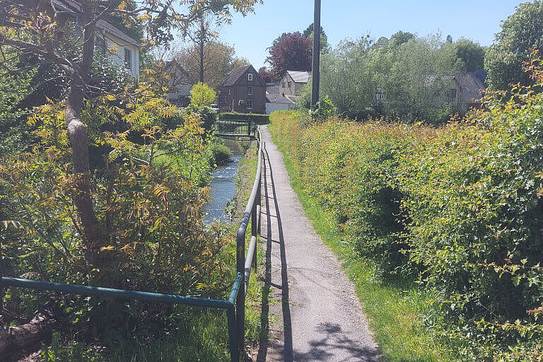 Direkt vor dem Aachener Bahnhof sieht man schon die bekannten Radwegweiser, nur in roter Schrift statt dem bei uns üblichen Grün. Die Innenstadt mit Dom und Rathaus ist auf jeden Fall einen Besuch wert. Ich wollte aber zügig raus aus der Stadt in Richtung Westen. Es gab viele Baustellen; Radwege sind größtenteils durchgängig vorhanden und auch gut ausgeschildert. Nach einem Anstieg und einer Abfahrt von knapp 3 km kommt man an die niederländische Grenze, die aus einem unscheinbaren Bächlein besteht. Wenn man die schmale Fußgängerbrücke überquert, hat man die Ausreise aus Deutschland geschafft.