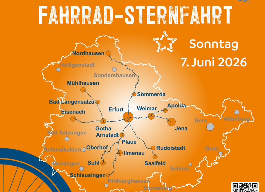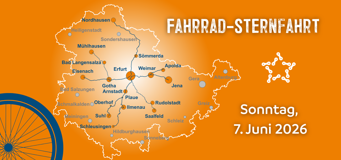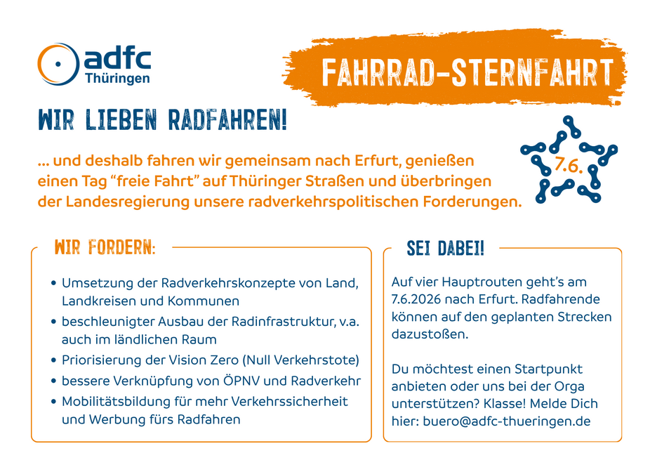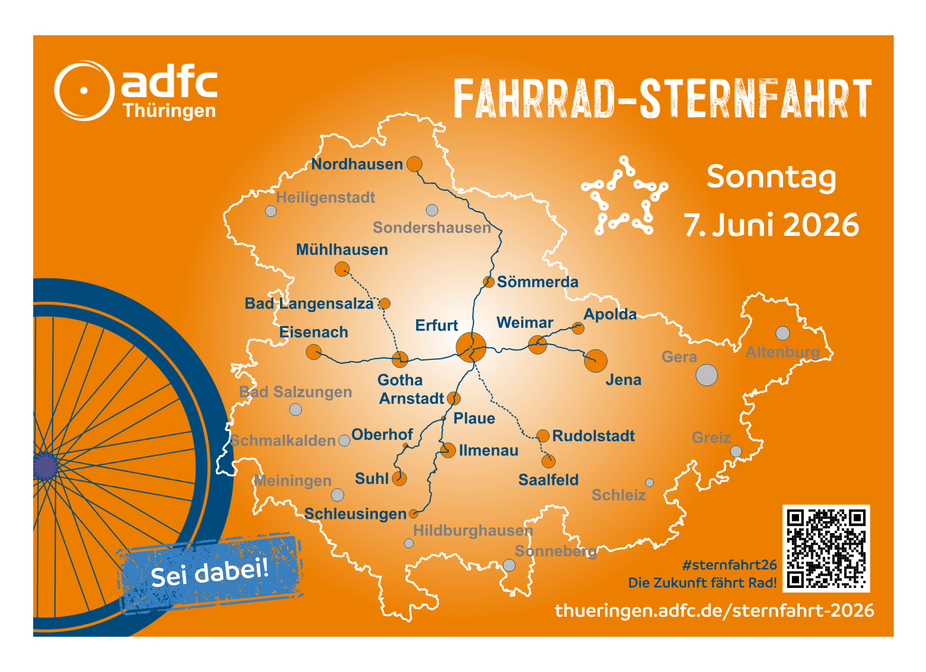 Zum ersten Mal veranstalten wir als ADFC Thüringen am 7. Juni 2026 eine Sternfahrt. Diese soll nicht nur eine unvergessliche Tour werden, sondern auch ein deutliches Zeichen für besseren Radverkehr setzen. Gemeinsam erobern wir die Straßen zurück und zeigen: Radfahren macht Spaß, ist gesund, trägt zur Gestaltung lebenswerter Städte und Regionen bei. Es entlastet den Verkehr und die Kassen von Land, Kommunen und Bürger*innen.