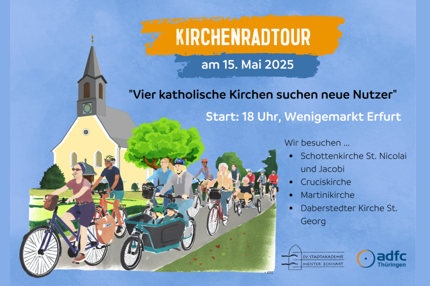 Am 15.5. veranstaltet der ADFC Thüringen in Kooperation mit der Evangelischen Stadtakademie Erfurt die nächste Kirchenradtour. Als Feierabend-Tour führt sie zu den vier katholischen Kirchen in Erfurt, die einer neuen Nutzung zugeführt werden sollen.