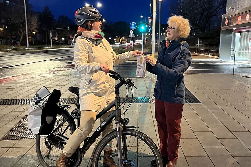 Schon nach einer Stunde waren mehr als 100 Tüten verteilt. Die Beschenkten freuten sich sichtlich über die Aufmerksamkeit. Viele äußerten, dass sie täglich mit dem Rad unterwegs sind und wie sehr sie dessen Vorzüge zu schätzen wissen.