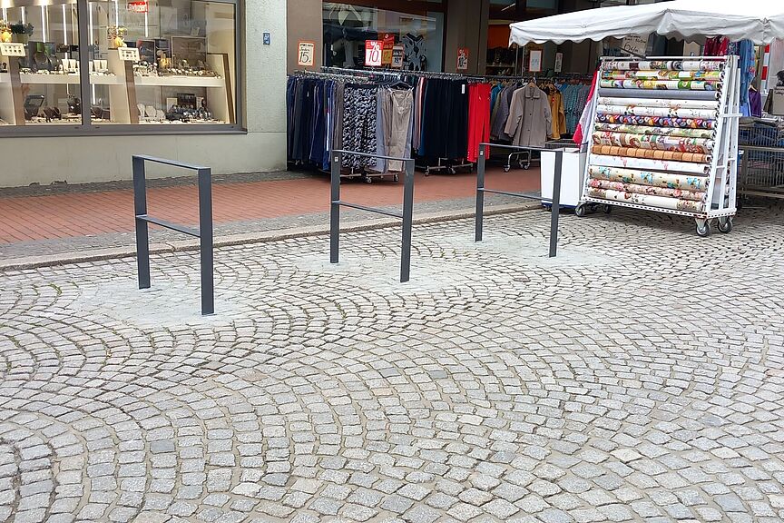 Auf der zentralen Achse der Innenstadt wurden vor wenigen Tagen drei neue Fahrradabstellanlagen installiert. Diese befinden sich im unteren Bereich der Straße und bieten Platz für insgesamt sechs Räder. Um die untere Sorge auch weiterhin flexibel für Veranstaltungen wie den Märchenmarkt nutzen zu können, wurden die drei ersten Abstellanlagen so eingefügt, dass sie bei Bedarf auch wieder entfernt werden können.
