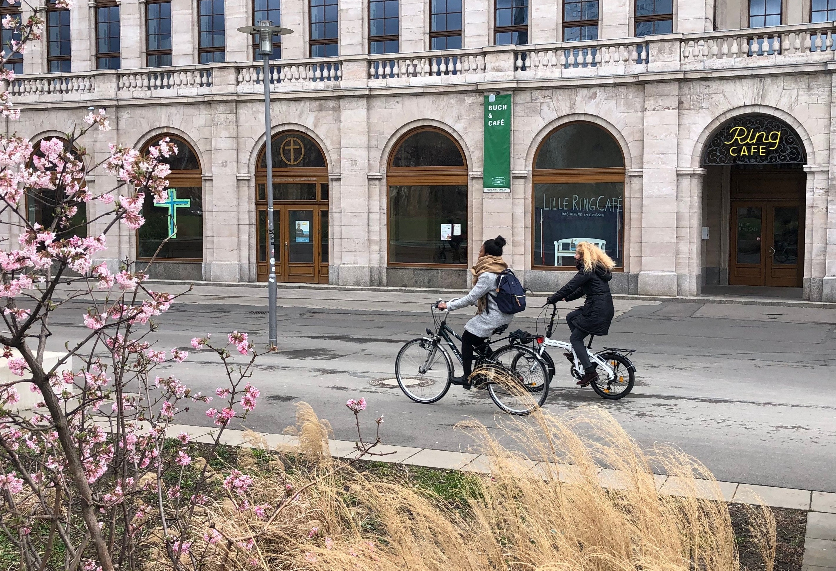 Zwei Radfahrerinnen in Leipzig im Winter
